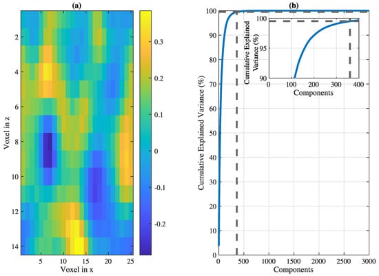 (a) Section example of a 3D Random Smooth Scalar Field with periodic boundary conditions in the x and y axis. Arbitrary units. Moran’s I = 0.5702. (b) Cumulative Explained Variance of 5184 Principal Components of a 10,000 (20 × 24 × 12 voxels) 3D Random Smooth Scalar Field Samples set. The 99.5% of the variance is represented by dashed lines with the number of principal components required.