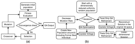 (a) General Genetic Algorithm Scheme. (b) Specific conducted GA Routine’s Scheme.
