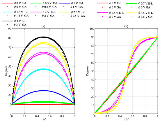 This study first examines a uniform pixel configuration based on an LC infinite cell. Throughout this work, the pixels are arranged two-dimensionally in the plane, with the z plane representing the direction of light propagation. This configuration enables us to obtain a set of canonical curves related to the director distribution along the thickness of the LC layer. Figure 3 shows solid-line results obtained through the minimisation of the free energy [8,9] via Equation (2), and our scheme based on the genetic algorithm (discrete points in Figure 3). Figure 3a shows the results for an infinite cell in the plane with a small pretilt and a parallel-aligned configuration, with the director lying in the -plane [8,36]. More specifically, the parameters considered are defined in Table 1.1 in [36]. The GA algorithm considers here a mesh of [z,x,y] = [54 × 5 × 5] with a spatial resolution of 0.1 m in the x and y-axis, and 50 nm for the z-axis. This setup implies solving 2700 unknown variables. However, with our PCA-GA method, the unknown variables are decoded by only 314 components. Figure 3a shows the twist angle related to Twisted-Nematic LC structures for different external voltages applied. Again, the results obtained through the genetic algorithm are compared to those obtained by minimising the elastic Frank–Oseen (FO) free energy by the Euler–Lagrange method, showing a good agreement between methods in all cases.
