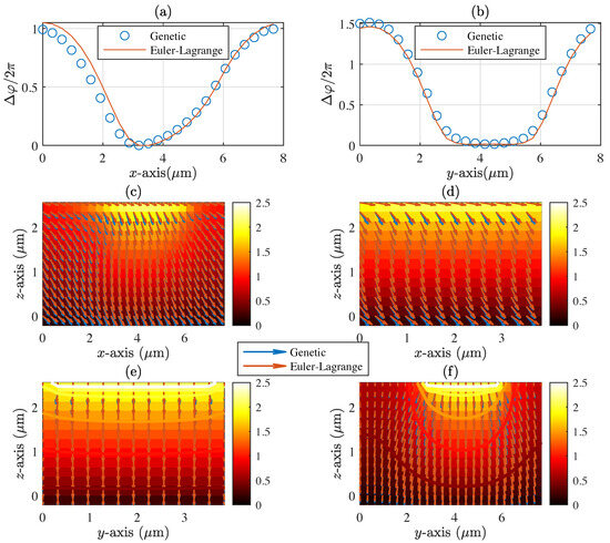 Numerical calculations for a 2-pixel period binary grating of 4 m. The external voltage applied to the electrode is 2.8 V on the top () and the ground electrode is in the bottom (). (a,b) represent the phase response computed by Equation (12) in [8] for horizontal (grating in x-direction) and vertical (grating in y-direction) gratings, respectively. (c–f) represents the visualisation of the distribution of the voltage (colour map) and the director orientation (blue lines): (c) , y = 2 m and -plane. (d) , x = 2 m and -plane. (e) , x = 2 m and -plane. (f) , x = 2 m and -plane.