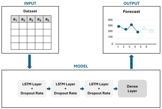 LSTM layers. A set of three LSTM layers, each of them with a dropout rate, to handle data sequences, capture long-term dependencies, and avoid overfitting or underfitting.