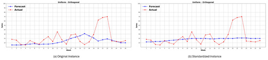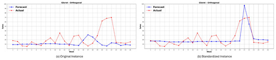 Figure 4 shows better results for when the data instance was standardized. The above is especially noticeable in the peak of higher sales in the actual data, where the standardized model allowed a better sales forecast than those made by the model with the instance in its original form, demonstrating, in the first instance, that standardization is a promising feature for allowing the model to generalize the information in a better way.