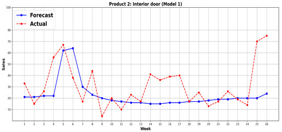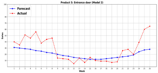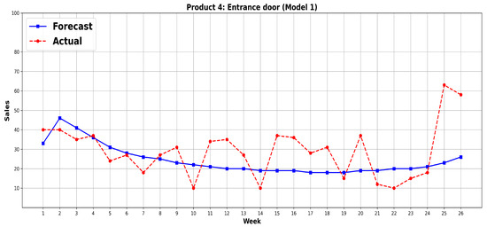 We used the models obtained from the trained LSTM networks to prove the test data for each product. The goal was to evaluate the performance of the models in forecasting product sales, considering the customized cost function proposed in this paper. To illustrate the behavior of the trained models,