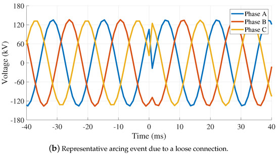 A loose bus connection can cause arcing, Figure 3b. This can be a loose screw or poor contact between the lines and the bus. The loose connection increases the dielectric constant within the connection and increases power draw, wasting energy. Additionally, arcing can lead to a fire if timely corrective actions are not taken. Figure 3b shows an arcing event around ms. After the event, each line phase is rotated , which is evident as the post-event phase of Phase A is equal to the pre-event phase of Phase C.