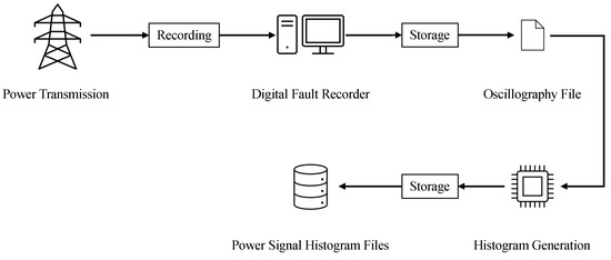 This section includes the background information for power line transmission recording, storage, and power signal histogram generation. Figure 2 illustrates the process that was followed to generate power signal histograms from the OSG files recorded by DFRs monitoring operational power transmission assets. The DFR stores the 24/7 power line transmission recordings using OSG files. While converting a power line transmission recording to an OSG file, the DFR periodically reads the OSG file’s stored data, performs power signal histogram generation, and stores the resulting histograms.