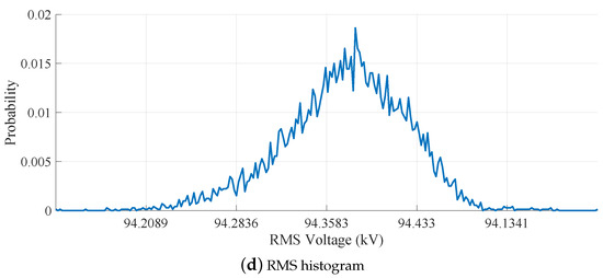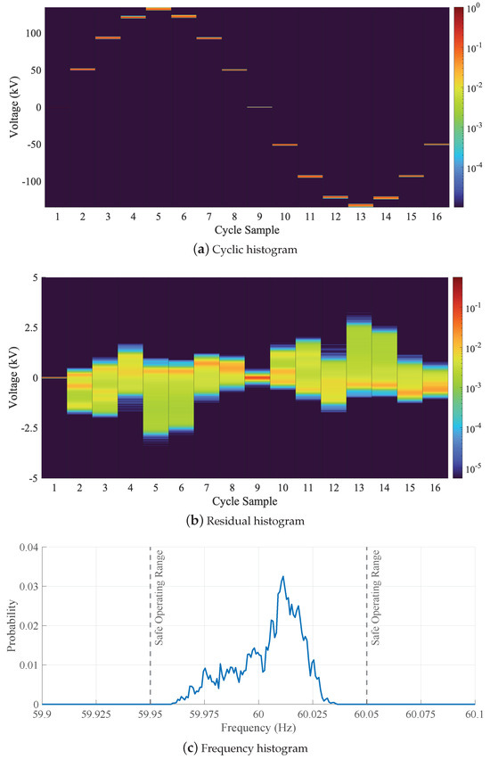 where is the voltage RMS value. For example, a 161 kV bus will have an operational voltage of kV. After subtracting the ideal cycle, the per-sample PMFs are generated. The numbers of histogram bins and voltage range are conditionally set to normalize the voltage steps across different residual histograms. If the observed voltage range is kV, the global voltage range is set to kV, and the number of histogram bins is set to . If the global voltage range is less than kV but greater than kV, the global voltage range is set to kV and the number of histogram bins is set to . Otherwise, the global voltage range is set to kV with 4098 histogram bins. This ensures that all residual histograms have the same voltage step size. The per-sample PMFs are generated using the selected global voltage range and number of histogram bins to create the residual histogram. A representative illustration of a residual histogram is shown in Figure 3b.