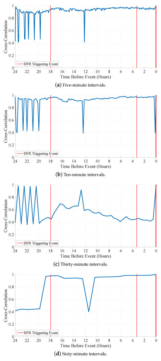 The cross-correlation values presented in Figure 4 are calculated using the reference residual histogram generated using the OSG data corresponding to the DFR’s last (a.k.a., most recent) triggering CVT failure event, designated as “zero hour” in Figure 4. The CVT failure events occurring eighteen and three hours before the last DFR-triggering CVT failure event are considered “blind tests” of the presented IFP approach. The high CVT failure likelihood value (i.e., a cross-correlation value above 0.9) one hour before the DFR-triggering CVT failure event occurs at hour eighteen, showing the viability of the presented cross-correlation-based IFP approach. This also indicates that a DFR can generate a histogram from a single event’s OSG data and then use it as a reference for IFP before the event grows strong enough to trigger a recorded DFR event.