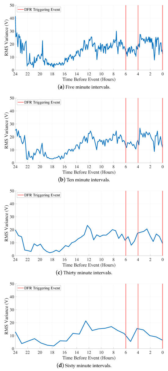 The RMS histograms are calculated using a window size of 60 cycles, 960 samples, a step size of 30 cycles or a total of 480 samples, and 256 bins per histogram. The results presented in Figure 5 show the absolute difference in RMS variance between Phase A and Phase B histograms at intervals of five, Figure 5a, ten, Figure 5b, thirty, Figure 5c, and sixty, Figure 5d minutes over a twenty-four-hour period. The arcing events occurred between these two phases, but a similar approach can be applied to arcing between any combination of two or more phases. DFR-triggering arcing events occur six and four hours before the third event at . IFP necessitates the detection of the significant voltage variations that can occur during an arcing event. These voltage variations are due to increases or changes in the resistance for a loose connection.