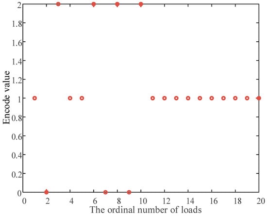 The first row of the S matrix, 1–20, represents the 20 loads shown; the second row, 1, represents the loads with an alternate power supply line, and 0 represents none; the third row represents the power supply path being used by the element, 1 represents the element using the normal power supply path, and 0 represents disconnection; the fourth row represents the use of an alternate power supply path by the element, 1 represents the use of an alternate power supply path, and the absence of an alternate power supply path is directly represented by a zero. Because of the uncertainty of the power supply paths used by the elements in the third and fourth rows of the matrix, x and y are used to represent the power supply paths.