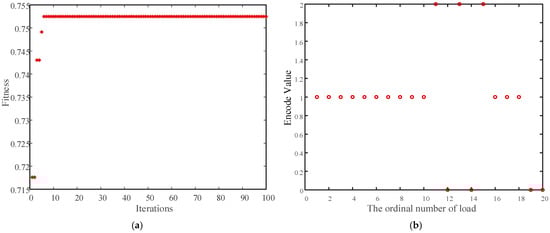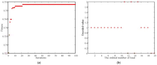 Simulation results of DSPA: (a) DSPA fitness changes; (b) optimal solution load switch code of DSPA.