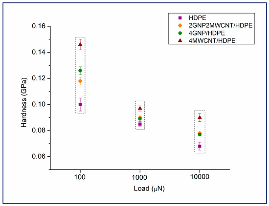 Nanohardness of the nanocomposite samples, including pure HDPE as a reference, measured at three different peak loads—100 μN, 1000 μN, and 10,000 μN.