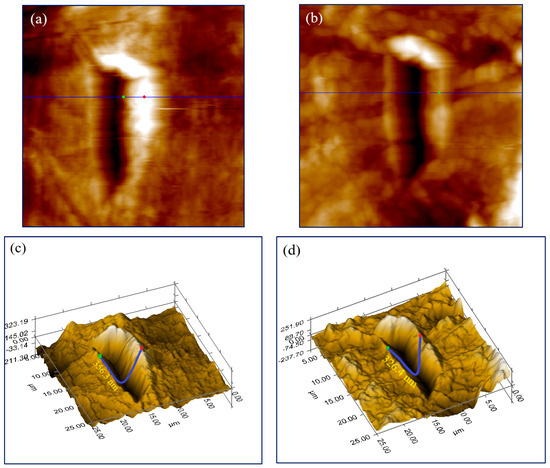 In-situ SPM imaging was used to illustrate the effect of GNPs and MWCNTs in the nanocomposite architecture on the height of material pile-up as a nanomechanical surface peculiarity affecting the study of the samples’ friction behavior (Figure 4a,b). Apparently, the presence of carbon nanotubes in the HDPE matrices of the nanocomposites leads to a lower height of pile-up that can be due to the better elastic and wear resistance properties of these two compositions, as already demonstrated by the nanoindentation analysis. Most significant scratch resilience at a 1000 μN constant load function was ascertained as regards the bifiller composite sample, whose lowest degree of side pile-up means shallowest residual penetration depth (see the 3D plots of scratch grooves in Figure 4c,d). The blue lines denote the loop of the indenter notch measuring the vertical distance of percolation, which was found to be 30 nm shorter with respect to the bifiller hybrid sample in contrast to the neat HDPE. For, the distinguishable elastic behavior of that material could be assigned to the hybrid nanocomposite structure of well-dispersed and interacting carbon nanofillers. On the other hand, the highest coefficient of friction has been calculated with respect to the monofiller nanocomposite containing 4 wt% graphene nanoplatelets—0.401.