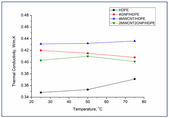 Polymers are usually characterized by very low thermal conductivity (0.1–0.5 W/m.K), which is strongly affected by the complex polymer morphology, crystallinity, molecular orientation, etc. [35]. Enhancing the thermal conductivity of polymers is important for many applications, and it has recently become a strategic research topic. The graphene-based polymer composites are expected to provide superior thermal conductivity due to the exceptional thermal properties of graphene, which are among the highest of any known material [36]. As anticipated, the addition of GNPs and MWCNTs significantly increased the polymer matrix’s thermal conductivity at all set temperatures. It can be seen that the highest thermal conductivity in the nanocomposite range was shown by the compound 4wt%MWCNT/HDPE, and the lowest was exhibited by the hybrid-polymer-based sample 2wt%GNP2wt%MWCNT/HDPE (see Figure 5).