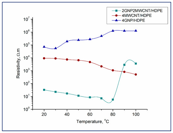 It has been observed that the composite sample with a 4 wt% GNP content as well as the hybrid nanocomposite 2wt%GNP2wt%MWCNT/HDPE exhibit a positive temperature coefficient (see Figure 6). It should be noted that the bifiller composite shows a percolation above 80 degrees, whereafter the resistance rises sharply. The reason of this leap in resistivity can be the joint work of the GNPs and MWCNTs in the hybrid material, establishing a more effective conductive network in the polymer matrix. The graphene particles, with their flat, plate-like structures, provide a large surface area for the conductive network, while the carbon nanotubes, with their tubular structures, provide the necessary interconnections between the graphene nanoplatelets. This combination results in an interconnected conductive network that is more sensitive to the thermal expansion of the HDPE matrix. Compared to the bifiller composite, the composition 4wt%GNP/HDPE demonstrated a smooth increase in resistance as well as higher electrical resistivity due to the not-well-established conductive network. In contrast, at the nanocomposite 4wt%MWCNT/HDPE, MWCNTs are the primary conductive particles, and their structures allow them to form a more interconnected conductive network in the polymer die, which is more stable and was not affected by thermal expansion; therefore, its resistivity hardly changes in the studied temperature range.