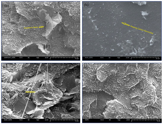 The presence and uniform distribution of the carbon nanofillers disposed in the HDPE matrix have been disclosed by applying the scanning electron microscopy instrumental technique. SEM images of the pristine GNPs and MWCNTs verified their high-quality morphological parameters (see Figures S1 and S2). Two types of nanocomposite sample pretreatment, including cross-sectional breaking under liquid nitrogen or acid-etching procedure [20], were tested because of the specifics of the crystalline spherulite morphology of HDPE hindering the readily disclosure of the carbon nanoparticles. Distinguishable graphene flakes popping out from the composite matrix (Figure 7a) or laying down over its cross-sectional surface (Figure 7c) were observed by SEM imaging using a secondary electron detector. The scans have been performed right after the cutting of the samples made in liquid nitrogen in order to avoid the impending polymer relaxation that would not allow the visualization of the carbon nanofillers. A heap of well-dispersed carbon nanotubes can be seen on the surface of the etched monofiller nanocomposite sample 4wt%MWCNT/HDPE (Figure 7b), explaining its already-established excellent nanomechanical and thermal properties. A comparison between that SEM micrograph and the SEM image of the neat polymer, which has not experienced acid etching (Figure 7d), discloses the adequacy of this type of sample pretreatment, leading to the removal of the upper spherulite layer and uncovering of the carbon nanotubes in the composite structure (see Figure 7b).