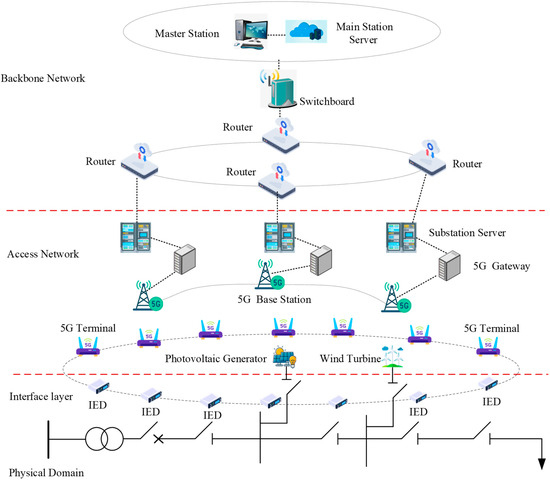 In the figure, the information domain is divided into the backbone network and the access network. The backbone network adopted the SDH (synchronous digital hierarchy) transmission protocol to connect the power distribution master station and substations. The access network adopted the 5G wireless network based on the IEC104 protocol to connect the distribution electronic station and intelligent electronic devices. The control command of the information layer determined the operation state of the physical layer, and the operation state of the physical layer determined the data input of the information layer, and there was a close interaction between the two.