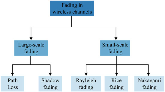 To provide a more intuitive explanation of the fading phenomenon in wireless channels, we created Figure 2. Figure 2 shows that the fading of wireless channels mainly includes large-scale fading and small-scale fading. Large-scale fading includes path loss and shadow fading, while small-scale fading mainly includes Rayleigh fading.
