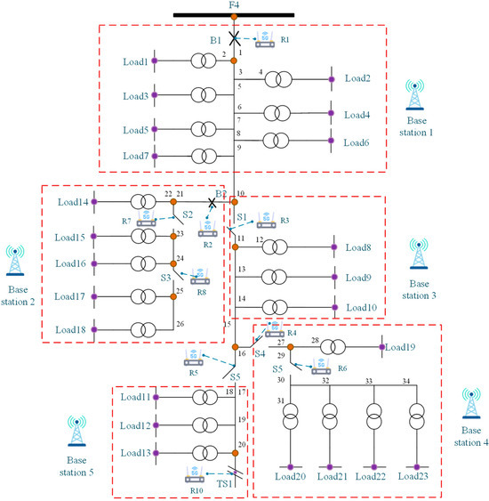 After establishing the theoretical model, we validated our method by constructing a simulation system. In this paper, the main feeder 4 of IEEE-RBTS BUS6 was taken as an example [22], and the system wiring is shown in Figure 3. This feeder contained 23 load points and 1225 users, totaling 34.26 megawatts. These parameters reflect a medium-sized distribution network and were sufficient to demonstrate the effectiveness of the model in handling complex networks. It also included distributed energy equipment, such as a 6 MW photovoltaic power generation unit and a 6 MW/32 MWh energy storage system. The reliability parameters of components in the system can be found in the reference literature [22]. Different from the traditional wired access network, the access network in this study adopted a wireless 5G communication network and the data transmission backbone network adopted a wired ring network structure, which included a total of five base stations, and the coverage area of each base station is shown in Figure 3.
