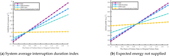 From Figure 4, it can be seen that changes in the failure rate of information equipment have different degrees of impact on the reliability of CPDSs, in descending order of IEDs, synchronous digital hierarchy SDH lines, SDH switches, and server communication nodes. With the increasing failure rate of components, IEDs have the greatest impact on system reliability. Due to their large number and high failure rate, a further increase in the failure rate will result in a large number of IEDs failing, thus reducing the reliability of the active distribution network. In comparison, servers have the least impact on system reliability due to their extremely low failure rate due to the presence of a backup mechanism. In summary, the development and use of high-quality IEDs, the addition of standby for SDH switches, and the regular maintenance of lines are all effective measures to reduce the failure rate of information systems and increase the reliability of active distribution networks.