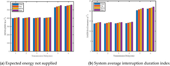 As can be seen in Figure 5, as the communication delay increased, the SAIDI index gradually increased. This indicated that in the CPDS composed of wireless communication, transmission delay had a huge impact on the reliability of the CPDS. Compared with wired communication, in the CPDS composed of wired communication, information was mainly transmitted through optical fibers. Its transmission channel was simple and it did not require complex forwarding and transmission. In addition, the risk of information loss was low. Therefore, the impact of information transmission delay on wireless communication was much greater than that on wired communication.