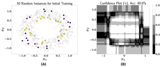 (A) Fifty labeled instances randomly selected for initial training of active learner; (B) confidence plot after initial training of active learner (accuracy: 80.6%).