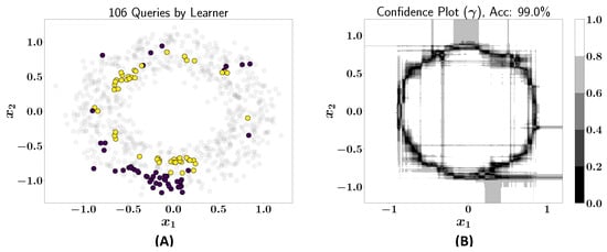 (A) The 106 queries issued by the learner; (B) confidence plot after including queries in the training dataset (accuracy: 99%).