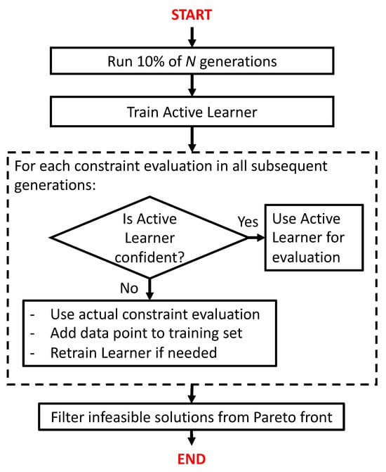 - Prediction of Feasibility: During the remaining generations, the active learner predicts the feasibility of the offspring solutions generated by the NSGA-II algorithm. If the learner’s confidence in the feasibility prediction exceeds a defined threshold , the candidate solution is accepted or discarded based on the prediction alone, bypassing the expensive constraint evaluation.