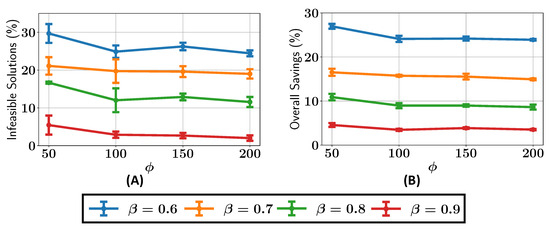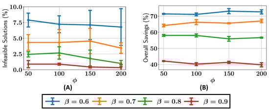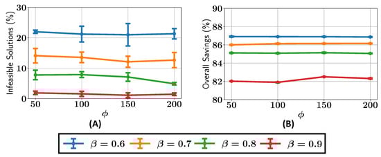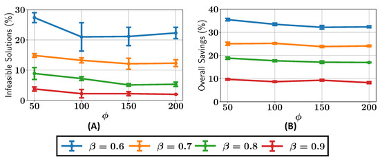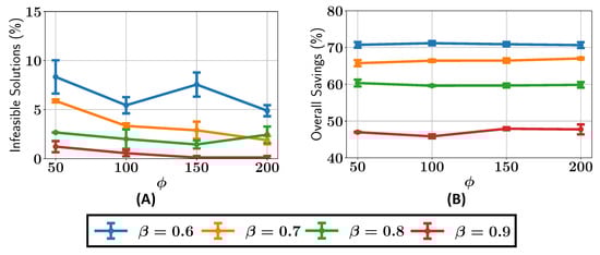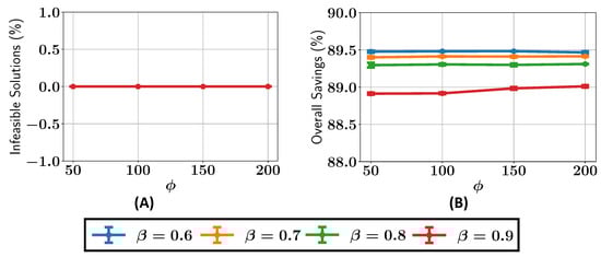 We next analyze the percentage of infeasible solutions present in the final Pareto fronts across various configurations of and , as shown in Figure 8A. For , the percentage of infeasible solutions remains greater than or equal to 5% for all the values of . When , the percentage of infeasible solutions is consistently less than 5% for , while for , the number of infeasible solutions drops to around 1%. It can be seen that as the value is increased, there are, overall, fewer infeasible solutions in the final Pareto front.