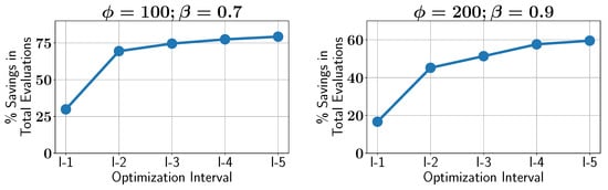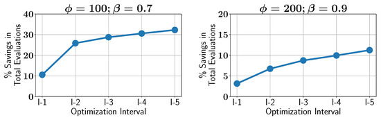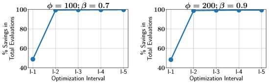 Case study IV: percentage of savings in constraint evaluations in different optimization intervals using ALMO in two different configurations.