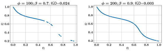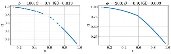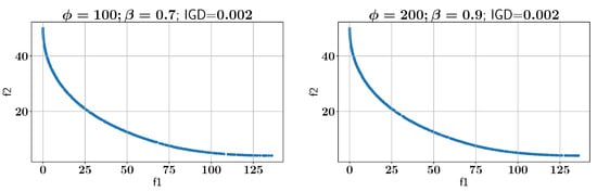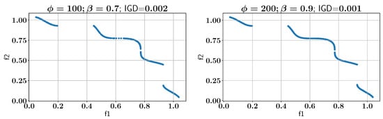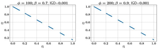 Subsequently, the ALMO approach is employed to solve the OSY problem, using two configurations of and , as shown in all feasible Pareto-front solutions in Figure 7. In the first scenario, is set to 100 and is set to 0.7, which results in an IGD of 0.002. In the second configuration, is increased to 200 while is set to 0.9, and the IGD remains at 0.002, indicating that both settings provide optimal solutions with low IGD values. However, the configurations show different performances in constraint handling, as discussed below.