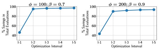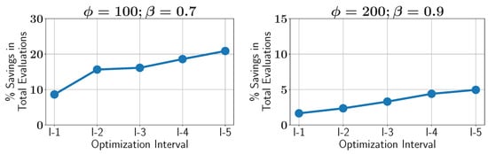 Case study I: percentage of savings in constraint evaluations in different optimization intervals using ALMO with two different configurations.