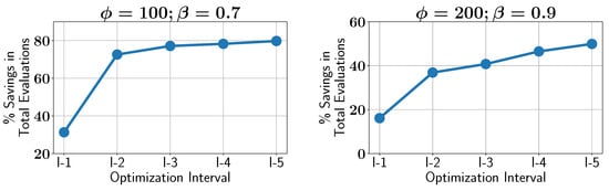 Finally, we investigate how the percentage savings in constraint evaluations increase over the optimization intervals. Figure 21 shows that as the optimization proceeds, the percentage savings increase. During the initial stages of the optimization, the savings are around 30% for and . However, as the optimization progresses and the active learner becomes more confident, the savings increase significantly, reaching about 80% in the final stages. A similar trend can be seen for the ALMO configuration with and , where the savings per interval increase from about 20% to 50%.
