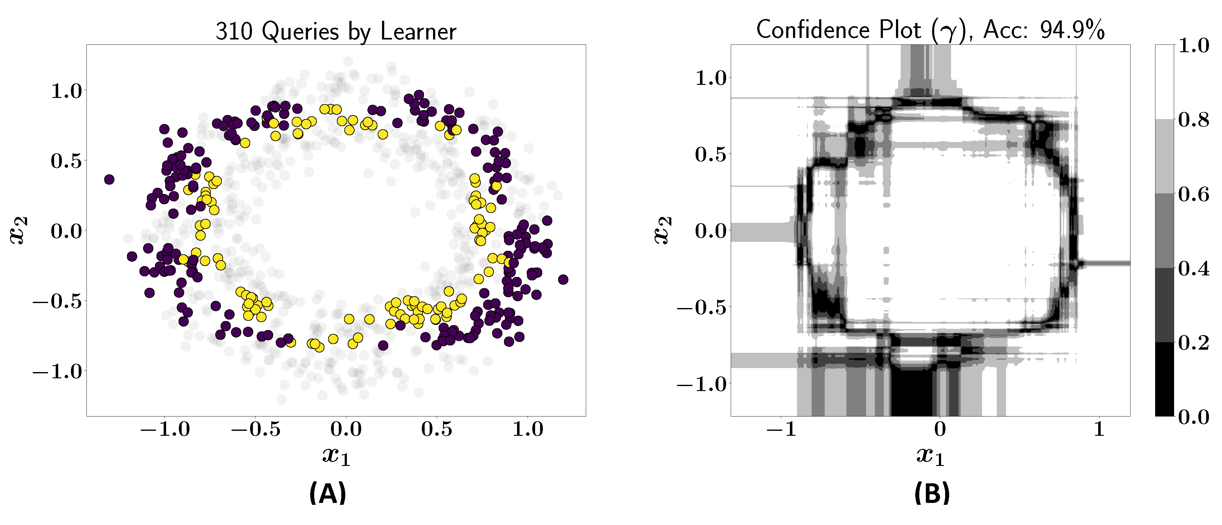 (A) The 310 queries issued by the learner; (B) confidence plot after including queries in the training dataset (accuracy: 94.9%).