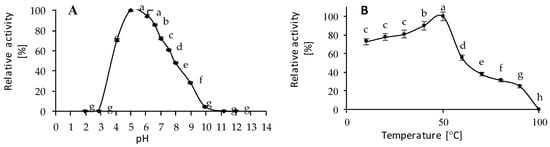 Based on the obtained results (Figure 1A), it can be concluded that PPO exhibits activity over a relatively wide pH range (from 4 to 9), with the optimum pH identified in the range of 5–7 (using pyrocatechol as a substrate). The highest activity was observed at pH 5. The enzyme very quickly lost its activity in an alkaline condition. Similar results were obtained by Gawlik-Dziki [20], who reported that the optimum pH for butter lettuce is 5.5 using catechol and 6.8 using 4-methylcatechol as substrate. Moreover, Xinglong and Xingfeng [21] showed that PPO activity is the highest in pH 4.5 using catechol as the substrate. In turn, Gonzales, De Ancos, and Cano [22] have reported that the optimal pH value for blackberry fruits was 6.5 using catechol as the substrate, and 5.5 and 8.0 for raspberry fruits using catechol as the substrate [23]. Generally, most vegetables and fruits show the highest activity at or near pH 7 in the literature [24,25], but these values may be different for PPO obtained from various sources of the enzyme and may be dependent on the substrate used in the reaction. In most cases, the pH optima have been reported to be between 4.0 and 8.5; it should be noted that they are dependent not only on the vegetable raw material but also on the purity of the enzyme being tested. Figure 1B shows the influence of temperature on PPO activities in the assay conditions (pH 5 and 0.05 M pyrocatechol as a substrate). The optimum temperature for PPO is 50 °C. Above this temperature, a rapid loss of enzyme activity was observed. What is surprising is that the enzyme was still active at 80 °C; however, the activity was relatively low (20% relative activity). The optimal value of the temperature for PPO is dependent on the source of the enzyme and also the kind of substrate used for the reaction. According to the literature data, the optimum temperature for PPO is in the range of 40–60 °C depending on the raw material. Similar results concerning the same enzyme, but isolated from a different substrate, were presented by Serradell, Rozenfeld, Civello, and Chaves [26]; Gao, Liu, and Xiao [27]; and also Navarro, Tárrega, Sentandreu, and Sentandreu [28]. They studied the optimum temperature for PPO isolated from strawberries (50 °C), Shona cabbage (60 °C), and persimmons (55 °C), respectively.
