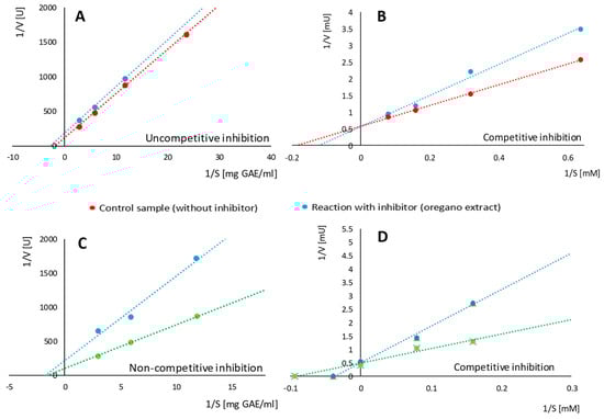 Mode of PPO inhibition by selected natural extracts (Lineweaver–Burk plots)—effect of substrate used: (A) PPO inhibition by oregano extract (endogenous substrate); (B) PPO inhibition by oregano extract (pyrocatechol as a substrate; (C) PPO inhibition by lovage extract (endogenous substrate); and (D) PPO inhibition by lovage extract (pyrocatechol as a substrate).