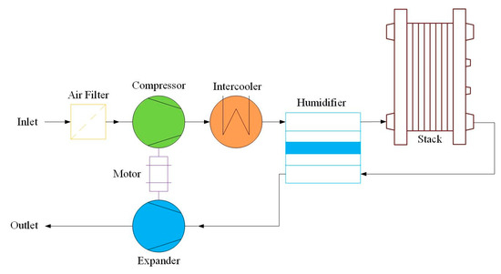 The challenges surrounding environmental degradation and energy crises have gained significant attention due to the ongoing advancement of modern industrial society [1]. As a result of minimal environmental pollution, remarkable energy conversion efficiency, low operating noise levels and high power density, the polymer electrolyte membrane fuel cell (PEMFC) has emerged as a highly preferred alternative for transportation, and distributed and portable power generation [2,3]. The air supply subsystem is a vital component of PEMFC systems to supply electrochemical reactions with filtered, pressurized and medium-temperature air as an oxidant [4,5], whose typical flowchart is shown in Figure 1, including air filter, compressor, intercooler, humidifier and expander. Several benefits can be obtained from using compressed air as an oxidant, such as increased stack output power, better water management, quicker dynamic response and smaller stack volumes [6,7]. However, it consumes approximately 20%~30% of the overall output power generated by the stack [8]. Thus, cutting the air supply system’s power consumption has emerged as a major obstacle in the development of PEMFCs.