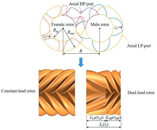 The TSE with a gear ratio of 4:6, which was previously used in studies [31,32], was selected as the reference case for a 100 kW PEMFC system. Figure 2 depicts the fundamental rotor structure of constant-lead and dual-lead rotors, whose key parameters are listed in Table 1. The variable lead of a screw machine results in non-uniform rotor surface properties, which further affect its geometric characteristics and thermodynamic performance. To improve the thermodynamic performance of TSEs, the effect of dual-lead curve parameters is explored in this paper, while the rotor profile is kept unchanged, and the various symbols used and their meanings are shown in Table 2.