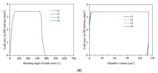 The variable-lead curves would also influence the leakage area via the leakage paths, further affecting the leakage characteristics of the TSEs. Figure 7 illustrates the variation in the leakage area via several leakage paths with the rotating angle and chamber volume. It can be observed that the leakage duration through any leakage path was the same for the four cases, as it was determined by the geometric properties of the screw rotors. However, there were sometimes significant differences in the terms of the corresponding chamber volume at which the leakage started via a blowhole, and ended via a rotor tip and HP end face, respectively. For instance, the leakage via a blowhole for both of cases #2 and #4 started at the same chamber volume of about 23 cm3. Followed by these were case #1 and case #3, indicating that the start of the leakage via a blowhole can be sorted by the lead of the HP segment of rotors. Furthermore, the variable-lead curves had a primary influence on the leakage area through the blowhole and rotor tip, a secondary influence on the leakage area via the contact line, but negligible influence on the leakage area via the HP end face. Specifically, the leakage area via each leakage path was mainly determined by the lead of the rotors with positive correction. Therefore, cases #2 and #4 had the same leakage area via each leakage path at the HP segment, as Figure 7 shows. Furthermore, case #4 had the largest leakage area via a blowhole, contact line and rotor tip, which indicates that a smaller lead and larger length of the HP rotor segment would result in a noticeably larger leakage area via a rotor tip, and consequently more severe leakage. Even though the leakage area via a blowhole would drop, its effect is weaker than that of a rotor tip due to the relatively lower value.