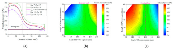 The influence of the lead and length of an HP rotor segment on the expander’s performance was simulated using a fixed rotor length of 110 mm, wrap angle of 220° and built-in volume ratio of 2.6. Figure 8 illustrates the influence of the lead and length of an HP rotor segment on p-V diagrams, suction pressure loss and indicated power of the expander. It is evident that the smaller lead and longer length of the HP rotor segment within the simulated parameter ranges leads to a lower suction pressure loss (Figure 8b), which means that the air pressure during the suction process is reductively smaller than the inlet pressure. It could be found that the suction pressure loss in the case of THP = 90 mm and LHP = 50 mm was lower than the constant-lead case by about 38 kPa. This further caused the increment in the indicated power by 25.4% (Figure 8c). The improvement can be attributed to an enlarged suction area caused by the smaller lead and longer length of the HP rotor segment, as shown in Figure 6. In addition, the largest suction pressure loss and lowest indicated power occurred at the largest lead along with the longest length of the HP rotor segment. When the length of the HP rotor segment was relatively small, it could not contribute to the reduction in the suction pressure loss and increment in the indicated power compared with the constant-lead rotors, even though the lead of the HP rotor segment was also small, which can be observed by comparing the p-V diagrams of the case of THP = 90 mm, LHP = 20 mm and the case of THP = 180 mm. It should be noted that for a given small lead of the HP rotor segment, the maximum allowable length of the HP rotor segment is limited by the wrap angle. For example, when THP = 90 mm and LHP = 60 mm, the wrap angle of the HP rotor segment was 240°, exceeding the overall wrap angle of 220°.