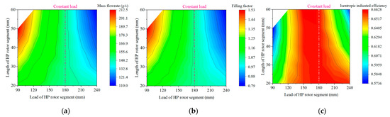 The larger suction pressure loss was caused by the inadequate suction, and thus would lead to the lower mass flowrate and filling factor, as Figure 9 shows. Therefore, the smallest lead with the longest length of the HP rotor segment (THP = 90 mm and LHP = 50 mm) yielded the highest mass flowrate of 212.1 g/s and filling factor of 1.53, which were approximately 45% higher than those of the constant-lead case. In addition, the filling factor exceeded 1, also indicating the severe leakage in the suction process, negatively impacting the expander’s performance. Although a larger mass flowrate entering the expander increased the indicated power, it did not result in an improvement in the isentropic indicated efficiency as depicted in Figure 9c. It can be observed from Figure 9c that the high isentropic indicated efficiency primarily concentrated near the constant-lead case. The maximum isentropic indicated efficiency of 0.6626 occurred at THP = 150 mm and LHP = 60 mm, surpassing the constant-lead case by 0.3%. Both a smaller and larger lead with a longer length of the HP rotor segment led to a decrease in the isentropic indicated efficiency. One possible explanation for this phenomenon is that the smaller or larger lead with a longer length of the HP rotor segment resulted in a significant mismatch between the internal and external pressure ratios. For instance, the gas pressure at the expansion end in the case of THP = 90 mm and LHP = 50 mm was 158.5 kPa, far higher than the outlet pressure of 100 kPa, whereas the gas pressure at the expansion end for the constant-lead case was 113.3 kPa, closer to the outlet pressure. Therefore, it should elongate the rotors when THP = 90 mm and LHP = 50 mm, and shorten the rotors when THP = 240 mm and LHP = 50 mm, according to Figure 8a.