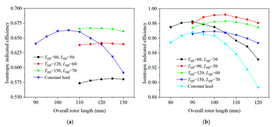 Effect of overall rotor length on isentropic indicated efficiency. (a) Considering leakage; (b) neglecting leakage.