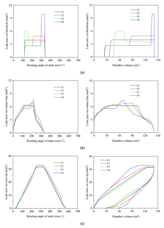 The variable-lead curves would also influence the leakage area via the leakage paths, further affecting the leakage characteristics of the TSEs. Figure 7 illustrates the variation in the leakage area via several leakage paths with the rotating angle and chamber volume. It can be observed that the leakage duration through any leakage path was the same for the four cases, as it was determined by the geometric properties of the screw rotors. However, there were sometimes significant differences in the terms of the corresponding chamber volume at which the leakage started via a blowhole, and ended via a rotor tip and HP end face, respectively. For instance, the leakage via a blowhole for both of cases #2 and #4 started at the same chamber volume of about 23 cm3. Followed by these were case #1 and case #3, indicating that the start of the leakage via a blowhole can be sorted by the lead of the HP segment of rotors. Furthermore, the variable-lead curves had a primary influence on the leakage area through the blowhole and rotor tip, a secondary influence on the leakage area via the contact line, but negligible influence on the leakage area via the HP end face. Specifically, the leakage area via each leakage path was mainly determined by the lead of the rotors with positive correction. Therefore, cases #2 and #4 had the same leakage area via each leakage path at the HP segment, as Figure 7 shows. Furthermore, case #4 had the largest leakage area via a blowhole, contact line and rotor tip, which indicates that a smaller lead and larger length of the HP rotor segment would result in a noticeably larger leakage area via a rotor tip, and consequently more severe leakage. Even though the leakage area via a blowhole would drop, its effect is weaker than that of a rotor tip due to the relatively lower value.