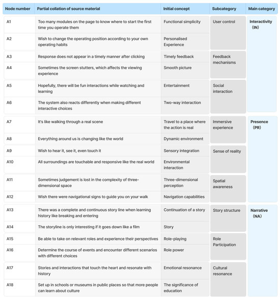 Based on the logical coding framework of grounded theory for measuring and identifying research variables [38], this study employed open coding and axial coding to analyze and summarize the logical relationships between perceptual factor features in user evaluations at the conceptual level, ultimately extracting core concepts. The NVivo 11 software was used to facilitate the analysis and design of coding nodes. During the open coding stage, raw data were analyzed sentence by sentence, with a focus on the research theme and purpose. Specific nodes related to feature perception dimensions were refined, resulting in the identification of 18 initial concepts. These concepts were then integrated based on similarities, with repetitive and intersecting concepts summarized. Initial concepts with a frequency of less than two and contradictory concepts were discarded. This process formed nine sub-categories, including user control, social interaction, immersive experience, and feedback mechanisms. Each sub-category was defined by a representative original statement to encapsulate the phenomenon. In the axial coding stage, the nine sub-categories were re-categorized according to the characteristics of augmented reality, allowing for the extraction of three higher-level main categories: interactivity, sense of presence, and narrative, which were identified as the critical user perception factors in the cultural education metaverse system. Finally, the six pieces of initial information reserved beforehand were coded and analyzed, and no new conceptual categories emerged. This indicated that the theory had reached saturation, allowing for the next step of summarization and generalization. The coding process is detailed in Figure 1.