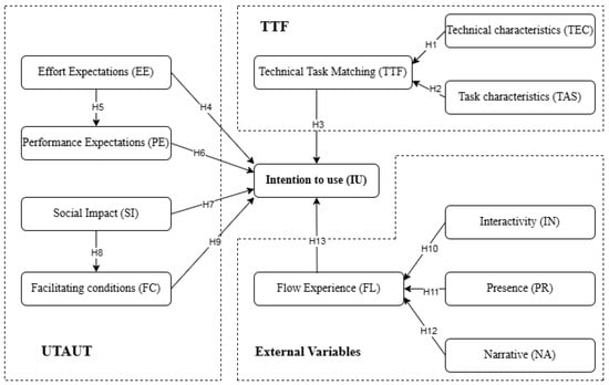 The TTF model is widely utilized to explain how new technologies can lead to performance improvements. It assesses the impact of technology adoption and evaluates the alignment between task requirements and technology characteristics [22]. Developed by Goodhue and Thompson in 1995, the TTF model explains how the alignment between task characteristics and technology attributes affects the degree of fit, influencing end-user performance and technology utilization. According to this model, users are more likely to adopt and consistently use information technology when it is perceived to be well suited to their tasks and significantly enhances their productivity or performance [13]. This implies that if a technology effectively supports communication and educational tasks related to cultural heritage while enhancing user experience and learning outcomes, it is more likely to gain widespread acceptance and usage. For instance, Wu et al. [22] proposed a TTF integration model to examine the ongoing intention to use MOOCs; Vanduhe et al. [23] applied a TTF model to evaluate the utility of gamification in sustaining the use of gamified training in higher education; and Sun et al. [24] explored visitors’ intention to use digital museums by integrating a new TTF model within the UTAUT2 framework, considering social distance. This underscores the importance of successfully applying new technologies in cultural heritage contexts. When combined, the UTAUT and TTF models create an integrated framework for elucidating and predicting end-user behaviors and intentions regarding the acceptance and adoption of new technologies [19]. This study aims to identify the influential factors for learning using metaverse platforms in cultural heritage education based on the combination of the UTAUT and TTF models. By providing a clear and logical explanation of the current situation, the study seeks to pinpoint the factors that significantly influence users’ engagement with metaverse technologies for educational purposes in cultural heritage.
