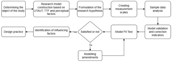 This study integrates the UTAUT and TTF models with external variables to construct a model that identifies the factors influencing users’ willingness to use the cultural education metaverse system. Relevant research hypotheses are proposed based on this model. Sample data were collected from 298 users, and structural equation modeling (SEM) was introduced to analyze the data and test the research hypotheses. This process helped determine the key factors influencing users’ willingness to use the system, and the linkages and commonalities between these factors were refined. The resulting insights were used to develop a corresponding design strategy to guide design practices. The flow of the research methodology is illustrated in Figure 3.