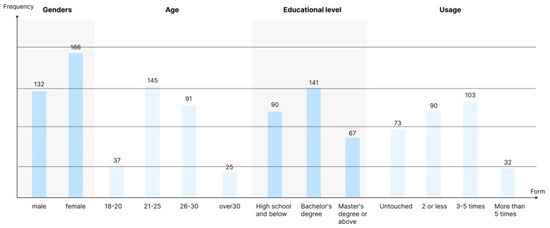 According to the results from the questionnaire, the percentage of female participants (55.8% of the total) was higher than that of male participants (44.2% of the total). The age range of all the samples was 19–38, with the most significant proportion of participants (48.6%) falling between the 21–25 age range. A bachelor’s degree, the most frequently reported level of educational achievement, was held by 47.3% of the population. About 34.4% of respondents, or the majority, reported having three to five usage experiences. Figure 4 provides specific details regarding the sample’s descriptive statistics.