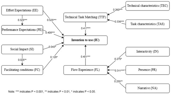 The empirical results of SEM indicate that interactivity, narrative, and presence significantly positively impact the flow experience, with presence having the most significant influence coefficient. Factors such as PE, EE, SI, FC, TTF, and flow positively affect users’ willingness to use the platform. Among these, TTF has the most decisive influence, while EE positively affects PE, and SI positively influences FC. Additionally, within TTF, both TEC and TAS have a significant positive impact on TTF.