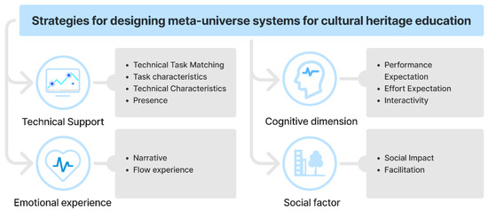 In the new era, China places significant emphasis on cultivating cultural self-confidence, enhancing public cultural literacy, and advancing the digital development of the cultural industry. These priorities have collectively propelled the dissemination and promotion of cultural heritage into a deeper stage of development [1]. Therefore, it is necessary to study how cultural heritage education can be effectively integrated with new technological tools. Integrating digital technologies with cultural heritage has revolutionized cultural asset management, preservation, and dissemination. This integration has also reshaped the structure of cultural industries, influencing consumption patterns, production methods, and channels of artistic communication [2]. Implementing advanced technologies such as virtual reality, augmented reality, and artificial intelligence can revolutionize how people experience, interact with, and study cultural heritage [3]. By creating immersive, personalized, and engaging virtual environments, metaverses can enhance the accessibility, interpretation, and preservation of cultural sites, artifacts, and assets [4]. Research on metaverses in the cultural heritage field primarily focuses on exploring technical applications related to cultural heritage and preservation [5]. However, users’ willingness to engage with cultural-heritage-based educational systems needs more analysis from a user-centric perspective. With in-depth research and a thorough understanding of users’ willingness to adopt new technologies and the factors influencing this willingness, it will be easier to fully realize the potential of these technologies in cultural heritage education and communication. This gap could impede the effectiveness of metaverse technologies in fostering user engagement, potentially leading to the allocation of resources to ineffective products and solutions [6]. This situation contradicts the goal of leveraging scientific and technological innovation to promote the innovative development of China’s cultural heritage, especially within the country’s current supply-side reform efforts [1]. Therefore, conducting in-depth research to encourage users to accept and engage with cultural-heritage-based metaverse educational products is crucial. This study explores the potential of meta-universes to facilitate cultural and academic promotion, increase users’ willingness to use these products, and close the gap between products and effective user engagement, filling a gap in the design field that lacks the involvement of user-perceived factors in design and providing more scientific design guidelines for the field. This study integrates user-perceived factors of cultural-heritage-based metaverse educational systems into the UTAUT from a user-centric perspective. These factors are combined with the TTF model and Flow Theory to analyze the determinants influencing users’ willingness to engage with cultural-heritage-based metaverse educational systems.