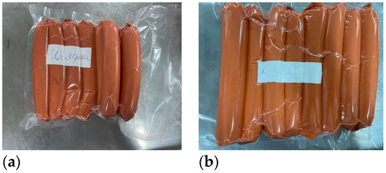 The stock solution for the extract was prepared by dissolving 500 mg of dry extract in 1 mL of ethanol to obtain an alcoholic extract, resulting in a final concentration of 500 mg/mL. After lyophilization, the extract was milled to achieve particle sizes capable of passing through a sieve with mesh openings of 100–150 microns (µm). This particle size provided sufficient powder dispersion, enabling uniform integration with other components of the sausage matrix and ensuring active interaction within the final product. This amount was selected because our pilot study showed that a higher amount of purslane powder negatively affects the organoleptic properties of the final product (imparting a bitter taste). Thermal processing was carried out until the internal temperature of the sausages reached 72 °C (Figure 1). The samples were produced at the experimental facility of Saken Seifullin Kazakh Agro Technical Research University.