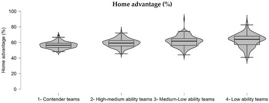Figure 2 shows the comparisons for HA and HW according to team ability. Analyses revealed significantly higher HA in contender teams compared to the rest of the team abilities (p < 0.001). High–medium-ability teams also showed significantly higher HA (p < 0.001) compared to low-ability teams. However, non-significant differences were found between the remaining groups for HA. Regarding HW, we observed significantly higher values in the contender teams compared to the teams with other ability levels (p < 0.001). Additionally, the high–medium-ability teams also exhibited significantly higher HW values (p < 0.001) when compared to the medium–low- and low-ability teams. Furthermore, the medium–low-ability teams showed significantly higher HW values (p < 0.001) when compared to the low-ability teams.